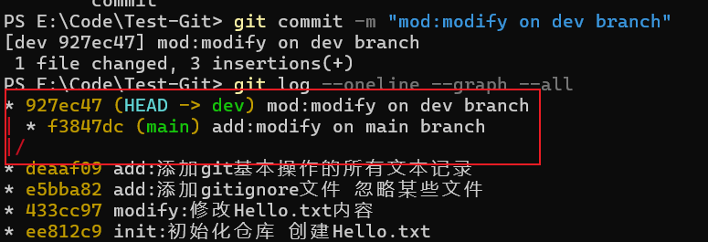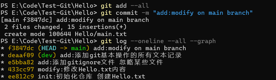 切换到dev分支后,可以看到之前在main分支修改前创建的Hello目录和main.txt文件,在dev分支下面并没有。这足以说明dev分支是在main分支当前那个状态下创建的。
