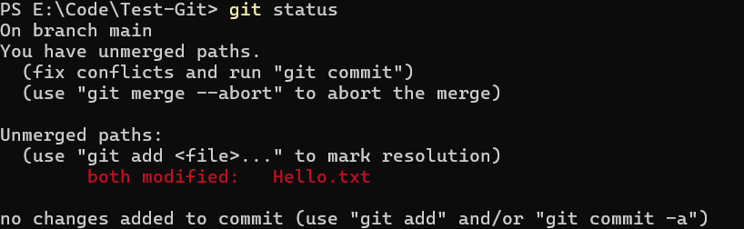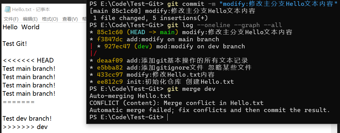 现在的情况是:main分支下Hello目录中新增的文本文件自动被合并了,但是呢?根目录下的文本文件存在冲突,也就是说主分支和dev分支这个文本中的相同位置存在差异,HEAD就是指当前分支。