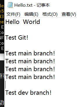 打开Hello.txt,删除 >>>>>HEAD ======== <<<<<<<<dev 这些标记,保留想要保留的内容。