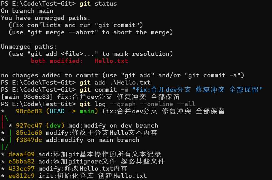 所以冲突解决的流程就是:git merge 合并分支 ---> 手动编辑文件决定保留哪些内容 ---> git add 标记已解决 ---> git commit 提交合并请求并形成一个新的提交记录。